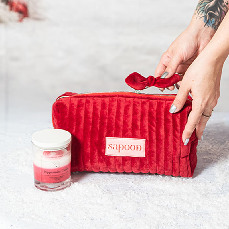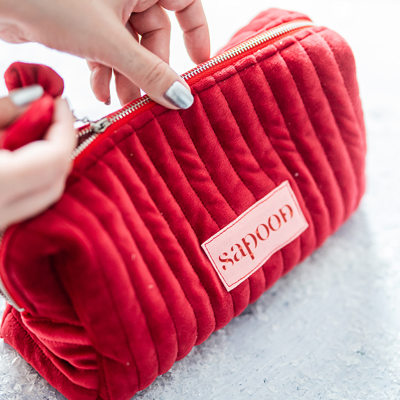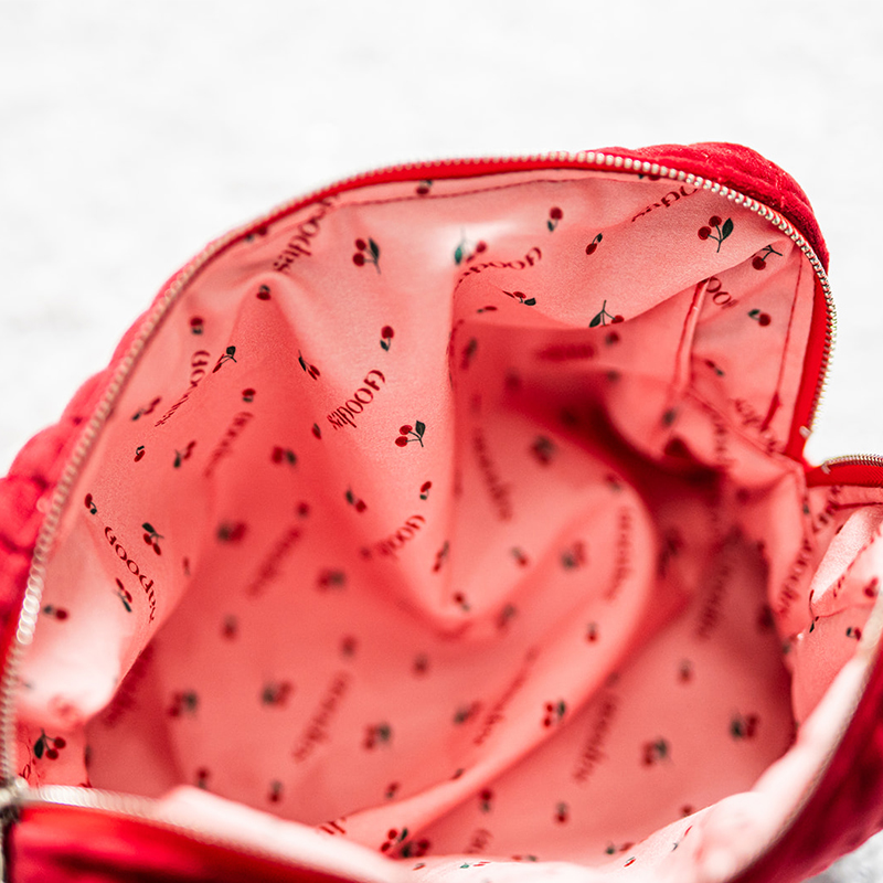 Cherry Bomb kozmetička torbica je izrađena od mekanog i izdržljivog baršuna sa platnenom podstavom. Idealne je veličine za sve kozmetičke potrepštine.